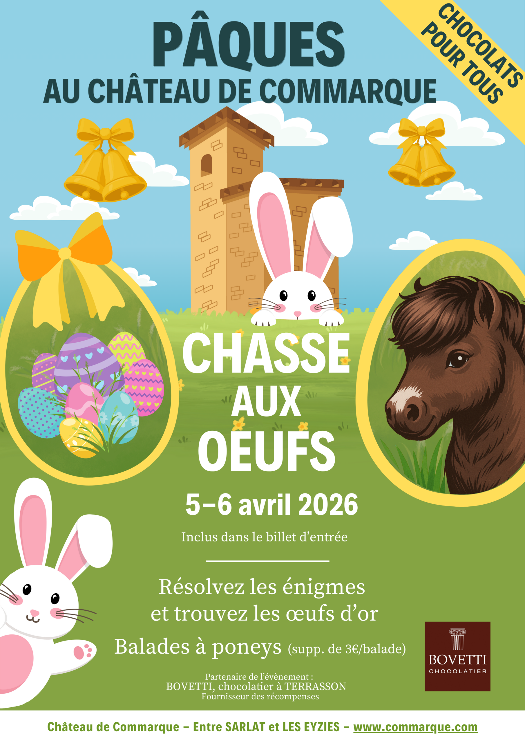 De 0 à 99 ans, venez chasser les œufs de Pâques seul ou en famille, et gagnez une récompense chocolatée. D’autres surprises sont au programme : balades à poney de 14h à 17h (supp. de 3€/balade) et foodtruck Chez Jeff.